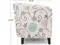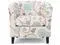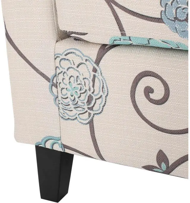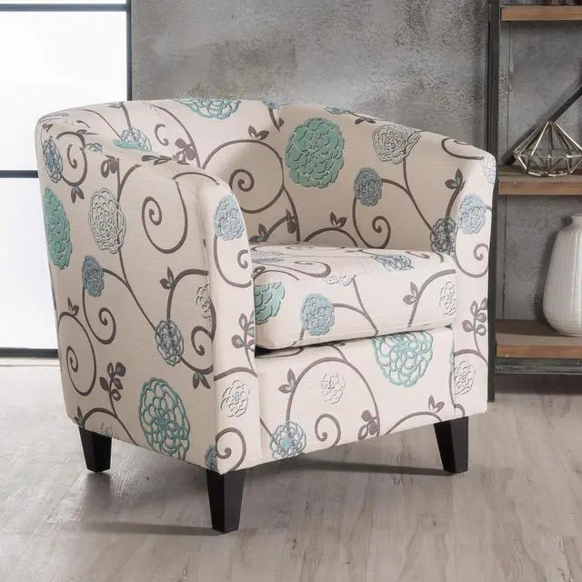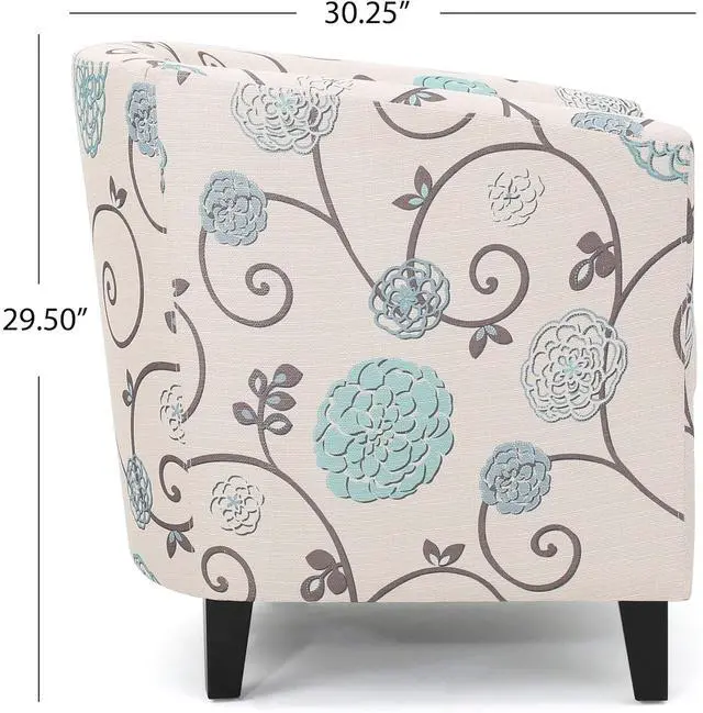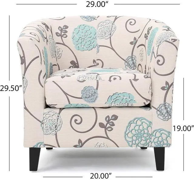 Add comfort and style to your space with this Upholstered Floral Accent Chair, designed to combine everyday comfort with timeless appeal. The white fabric upholstery with blue floral detailing creates a warm, inviting look that enhances living rooms, bedrooms, reading nooks, or home offices. The padded seat and curved tub-style backrest provide supportive comfort for relaxing, reading, or casual seating. Its compact barrel chair design makes it ideal for small spaces without compromising on comfort or style. Built with durable fabric upholstery and solid wood legs, this accent chair is made for daily use while maintaining a refined appearance. Whether used as a statement piece or paired with existing furniture, it offers both function and elegance.