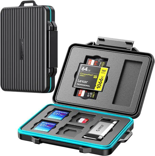 Product Weight: 84g Product Advantage Compact & Lightweight--- Easy carrying SD Card and TF Card holder by simply slipping into camera bag. Storage case with hanging hole, easy to match the mountaineering buckle. Special design ---design with 12 slot for SD card and 12 slot for Micro SD cards, small size, big capacity Good protection to your cards---Dedicate tooling, with good material and nice closure, makes it shock resistant, water-resistance (cannot immerse into the water) Durable---High quality ABS material, durable and have a long life span. Shockproof---Hard protective exterior shell for most safety of memory cards. Anti-static---Powerful Shield For Static, Anti-static EVA foam provides strong protection from static. Dustproof, Waterproof, full protection---This SD cards holder can protect your cards from destroying, missing. It can protect your cards from drip water, but cannot be used in water and in the rain. Please take care of this before purchasing. Easy one-touch open or close What's in the package? 1 X Ouer package 1 X TF (Micro SD) Card×12, SD Card×12 Storage Case 1 X Carabiner 1 X Tags 1 X After-sale service card
