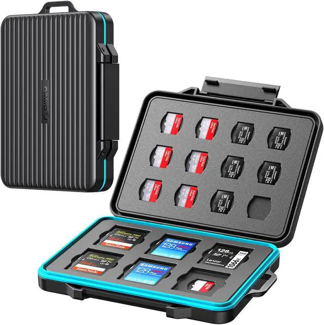 Product Weight: 84g Product Advantage Compact & Lightweight--- Easy carrying SD Card and TF Card holder by simply slipping into camera bag. Storage case with hanging hole, easy to match the mountaineering buckle. Special design ---design with 12 slot for SD card and 12 slot for Micro SD cards, small size, big capacity Good protection to your cards---Dedicate tooling, with good material and nice closure, makes it shock resistant, water-resistance (cannot immerse into the water) Durable---High quality ABS material, durable and have a long life span. Shockproof---Hard protective exterior shell for most safety of memory cards. Anti-static---Powerful Shield For Static, Anti-static EVA foam provides strong protection from static. Dustproof, Waterproof, full protection---This SD cards holder can protect your cards from destroying, missing. It can protect your cards from drip water, but cannot be used in water and in the rain. Please take care of this before purchasing. Easy one-touch open or close What's in the package? 1 X Ouer package 1 X TF (Micro SD) Card×12, SD Card×12 Storage Case 1 X Carabiner 1 X Tags 1 X After-sale service card
