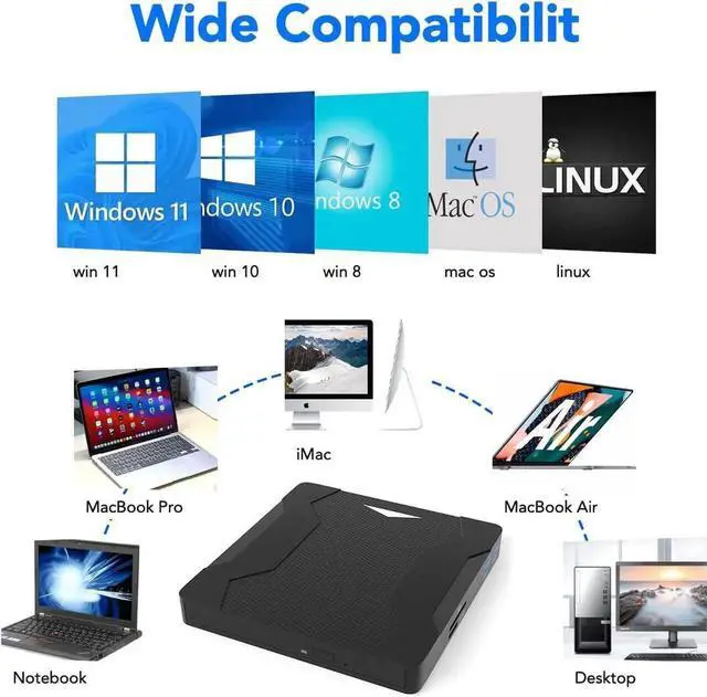 Our USB DVD drive is compatible with Windows 11/10/8/7, Linux, Mac OS and other systems. You can use this External DVD Drive for laptop to listen to music, watch movies, play games, burn data and install Software etc.