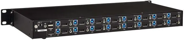 Features Connects 16 HDMI-Enabled Devices to a Single HDMI Monitor Keyboard and Mouse This rack-mount KVM switch lets you access control boot and reboot up to 16 computers or other devices with HDMI ports at the same time. In addition to desktop and notebook computers the switch also connects up to 16 media centers gaming systems Blu-ray and DVD players cable and satellite boxes and DVRs and other HDMI-enabled devices. All 16 computers share one HDMI monitor USB keyboard and USB mouse which saves space on your desk or workspace. Connect up to 256 Computers to One Original Console You can also cascade up to three levels of B024-HU16 KVM switches allowing centralized access to as many as 256 computers using a single monitor keyboard and mouse.