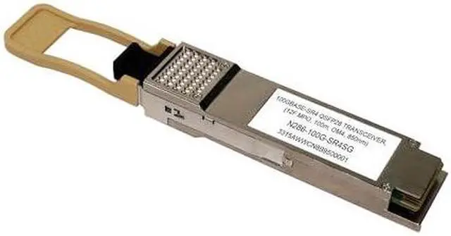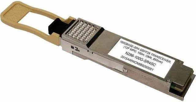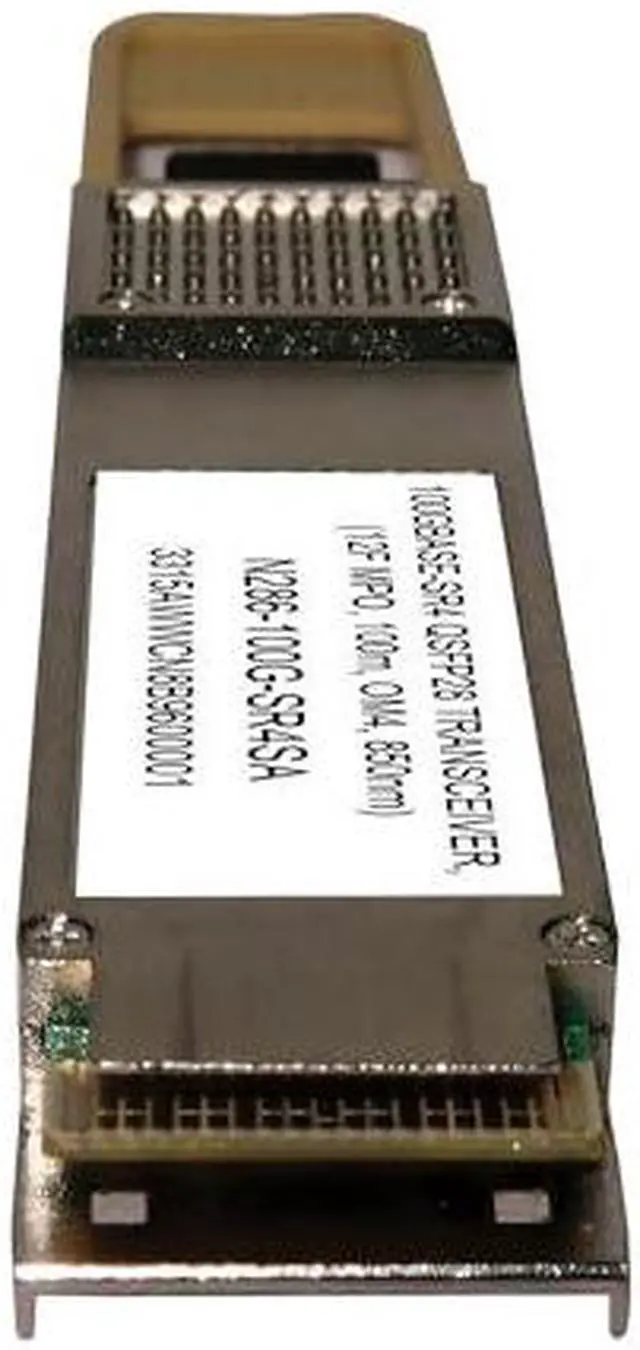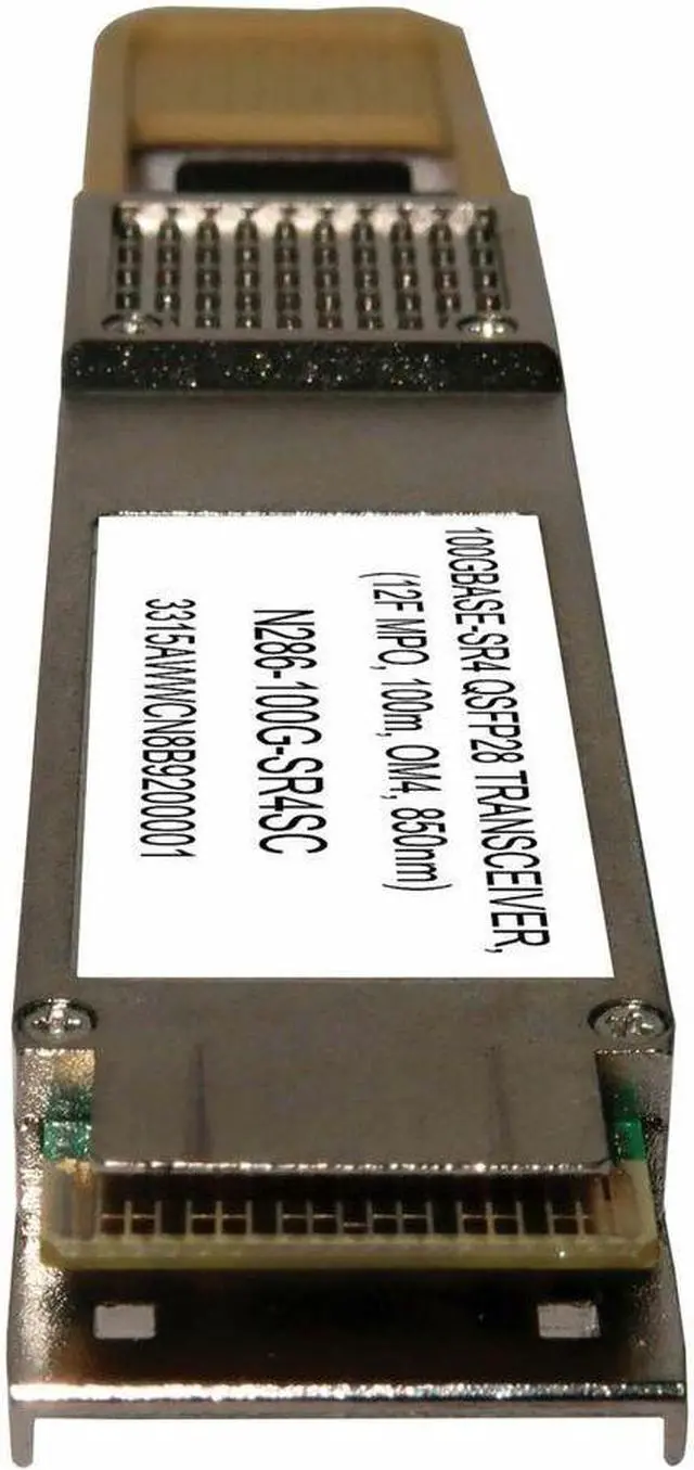 Details: QSFP28 Transceiver Designed for Connection to Your Cisco Network Switch or Server This QSFP28 transceiver allows you to connect a multimode fiber optic cable to a 100 Gbps network router server or switch. It transmits data up to 100 meters (328.08-ft.) using an 850 nm wavelength. The zinc housing protects against electromagnetic interference (EMI) and excessive power dissipation. Functionally Equivalent to Cisco QSFP-100G-SR4-S Transceiver Module The MSA-compliant N286-100G-SR4SC functions just like the equivalent Cisco QSFP-100G-SR4-S transceiver module and is manufactured to meet or exceed Cisco specifications. You can use this transceiver with any compatible Cisco router server or switch and receive the same performance as the QSFP-100G-SR4-S. Hot-Swappable for Installation Without Network Interruption This input/output device is fully hot-swappable so you can install it without a potentially costly 100 Gbps network shutdown or device reboot. Just plug the QSFP28 end of the transceiver into your Cisco network device. The other end has an MTP/MPO connector to link with multimode fiber cable (sold separately). A push/pull tab connector is easily accessible in high-density data center applications and makes the plug-and-play transceiver easy to install and remove with one hand. Supports Digital Diagnostic Monitoring (DDM) for Real-Time Status Monitoring DDM support lets you keep track of various operating status in real time including transceiver temperature input and output power and supply voltage.