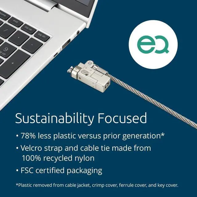 Designed using 78% less plastic versus prior generation, the Velcro strap and cable tie are made from 100% recycled nylon, and the product is delivered in Forest Stewardship Council (FSC®) certified packaging.**Plastic removed from cable jacket, crimp cover, ferrule cover, and key cover
