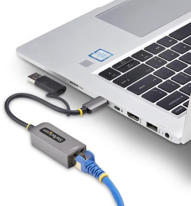 Add an Ethernet port to a USB-C or USB-A computer supporting up to Gigabit speeds w/autonegotiation for 10/100/1000Mbps BASE-T Networks; Built-in 6in/15cm cable; Status LEDs; Bus powered; Windows/MacOS/iOS/ChromeOS; Realtek RTL8153B; 9K Jumbo Frames