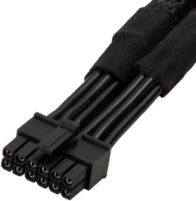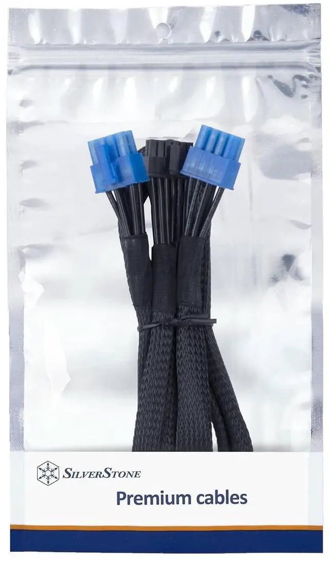 Standard PCIe 8 pin x 2 (PSU) and 12 pin (GPU) connector. Compatible with SilverStone modular power supplies which uses blue PCIe 8 pin connector. High flexibility braided cables