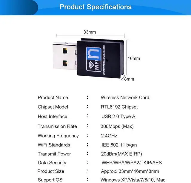 CHIPAL Mini adaptateur WiFi USB 300Mbps carte réseau sans fil 802.11n 2.4GHz antenne LAN récepteur Wi-Fi Ethernet pour ordinateur PC