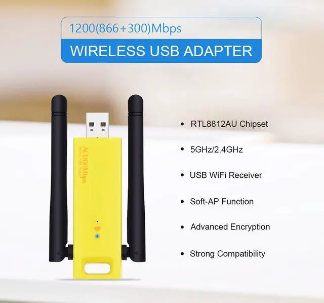 CHIPAL adaptateur WiFi 802.11AC 1200Mbps USB 3.0, carte réseau sans fil externe, antenne 4dbi, PC LAN, récepteur Wi-Fi, Dongle AP souple