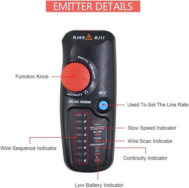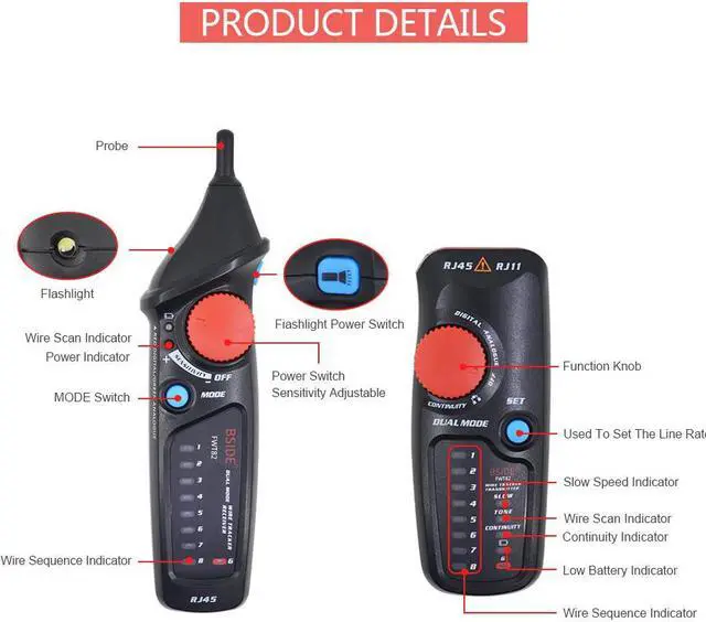 1. Suivi des fils: il peut rapidement trouver les paires de lignes requises parmi de nombreuses paires. Il est adaptable au terminal de câble réseau RJ45, au terminal de ligne téléphonique rj11. Il peut tester d'autres fils métalliques via un adaptateur.