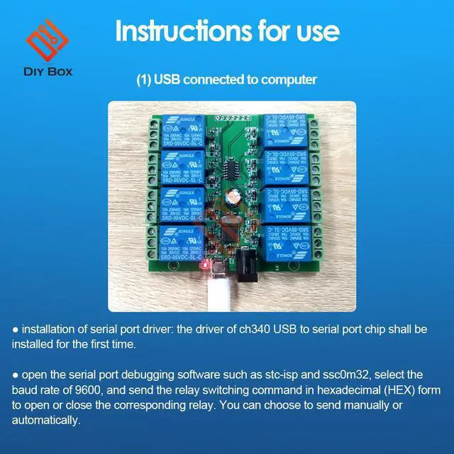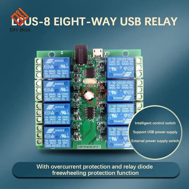 The LCUS-8 USB relay module is equipped with a stable USB-to-serial chip and microcontroller. It can use the serial port debugging software to send serial commands on the computer to control the on and off of 8 relays. It can also send commands to query the status of the relays.