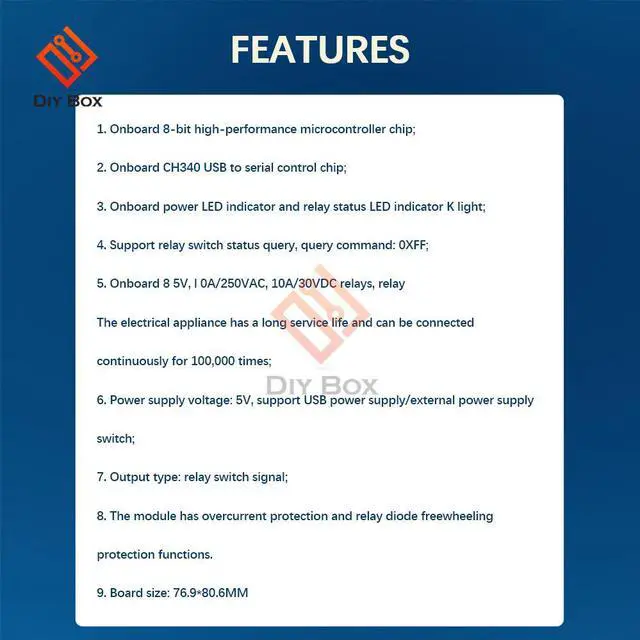 5. Onboard 8 5V, l 0A/250VAC, 10A/30VDC relays, relay