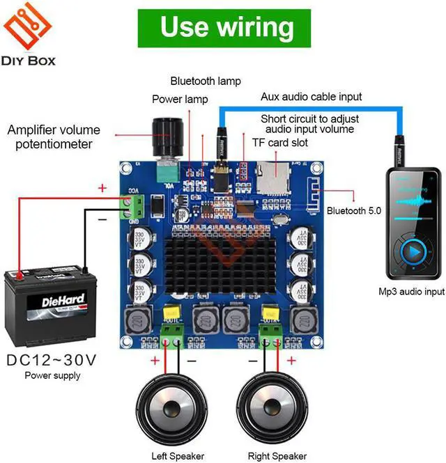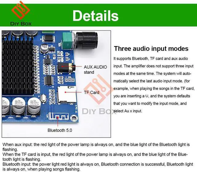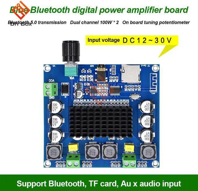 XH-A105 digital power amplifier board with high fidelity and two-channel stereo sound quality; input voltage is DC 12~24V, audio input supports Bluetooth, TF card, AUX 3.5mm audio line input, can be directly connected to mobile phone, MP3, etc.; power amplifier board It also comes with a volume adjustment function, which rotates the chirp potentiometer clockwise to zoom in and counterclockwise to decrease.