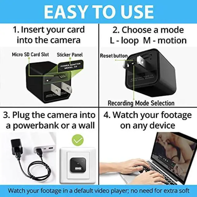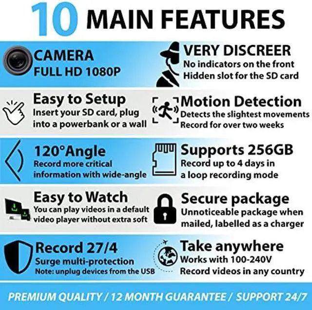 AlphaTech Ultra Spy Camera Charger is the easiest way to protect your life, businesses and personal property. Catch your spouse cheating, cheaters, frauds, thieves. Check on on employees, customers, babysitters, nannies at home, work, office, etc. Know more with the Spy Camera Charger, and catch much critical information for your needs in the Ultra 1080P high-definition video! Discrete design without indicators and sounds. It makes your camera completely undetectable.