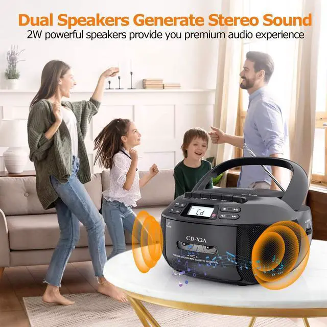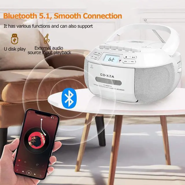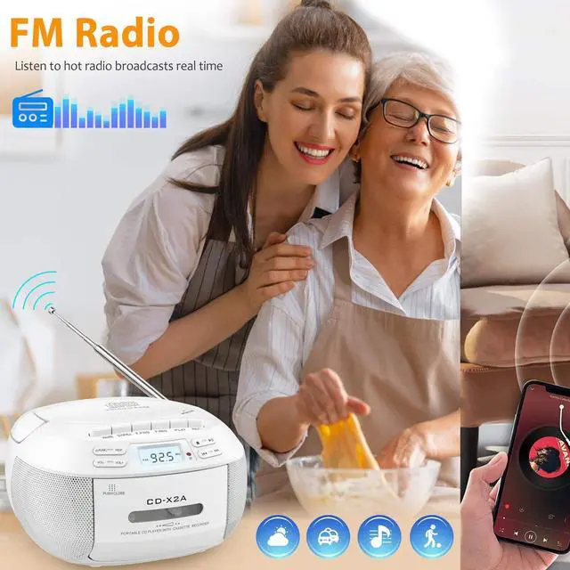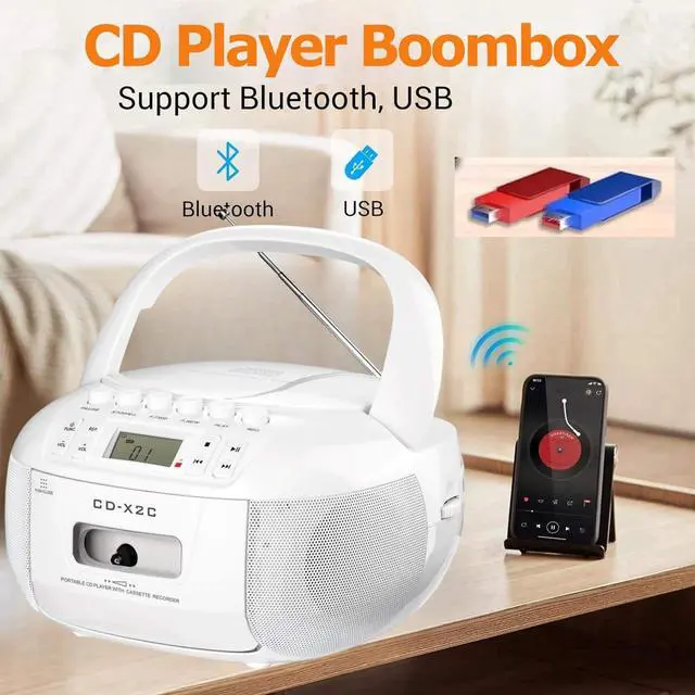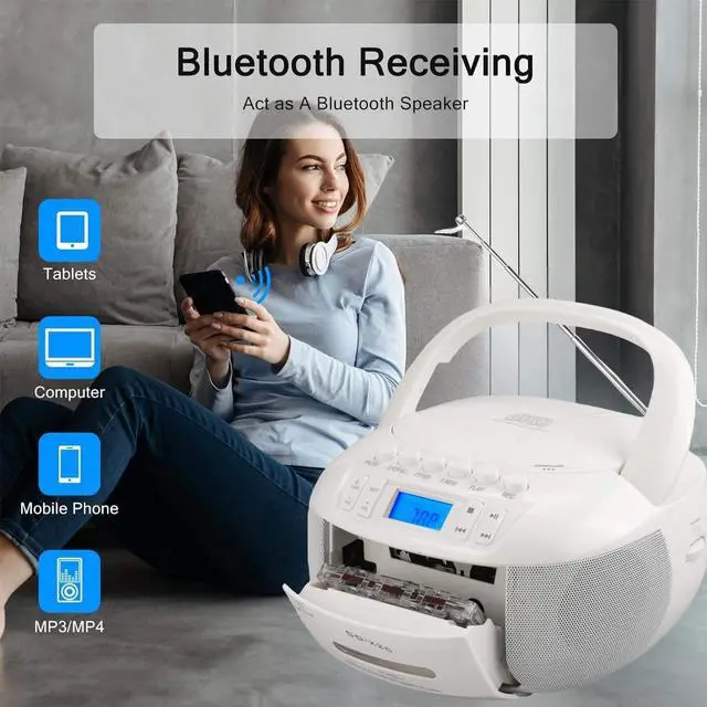 New Upgraded-CD Cassette Player: With built-in 3W dual speakers,you can enjoy your favorite collection of CDs or personally recorded CD-R/CD-RW discs on this CD player boombox,providing you a stereo sound and better music enjoyment with cassette function.This CD cassette player enables you to listen to your tape at leisure,letting you recall the good old day.No matte use this CD player for entertaiment or study,it will be your good choice.Supports programming song under CD and USB modes. Boombox Music Player: Besides to play CD and cassette,there are other 3 ways to play music.With Bluetooth function,this boombox for sensiors can connect your Bluetooth devices in less than 1 second or use the auxiliary cord to connect your phone/computer to enjoy music.Also works to plug in a USB drive loaded with your favorite songs or audiobooks to play.The included remote control enables you to control this CD boombox player from the distance up to 20 feet,no need to get close to use. AM/FM Radio+Tape Recording: Turn to the radio mode, then you can have a good time to listen talk show; NFL; NPR; news on this boombox CD player. Equipped with a clear LCD screen, it is convenient for you to tune more visually and a long antenna is designed to enhance the reception. The tape recording function is suitable for those who wants to record the fragment when listen to music or radio. A nice CD cassette player for both kids and elders with simple operation. Two Ways to Chagre: Two ways for you to power this CD cassette player. Mainly charging way is directly plug the AC cable in the wall to charge this CD player while you are indoor. Another is insert 6*C size batteries into this CD boombox player when you go out side or meet power outage, ensuring your happy music time can lasts. A handle on this CD player boombox makes it excellent to take on the go and an earphone jack allows you to have a more personalized listening experience anytime.