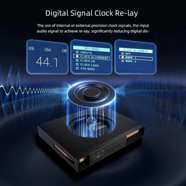 V.M.V T2 clock input and output : support 44.1kHz word clock and 10MHZ standard clock or atomic clock, can be 50or 75 input impedance matching . Digital signal clock Re-lay :The use of internal or external precision clock signals, the input audio signal to achieve re-lay, significantly reducing digital distortion.