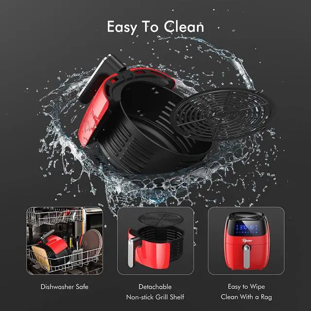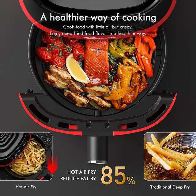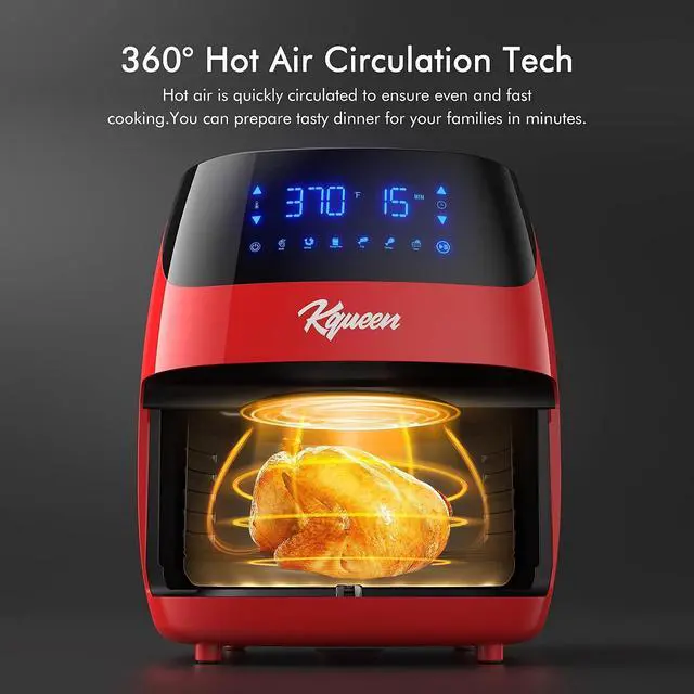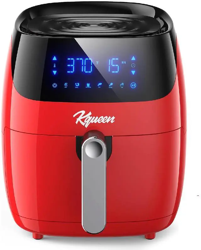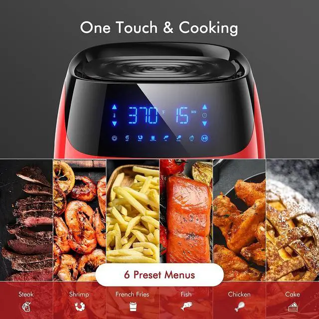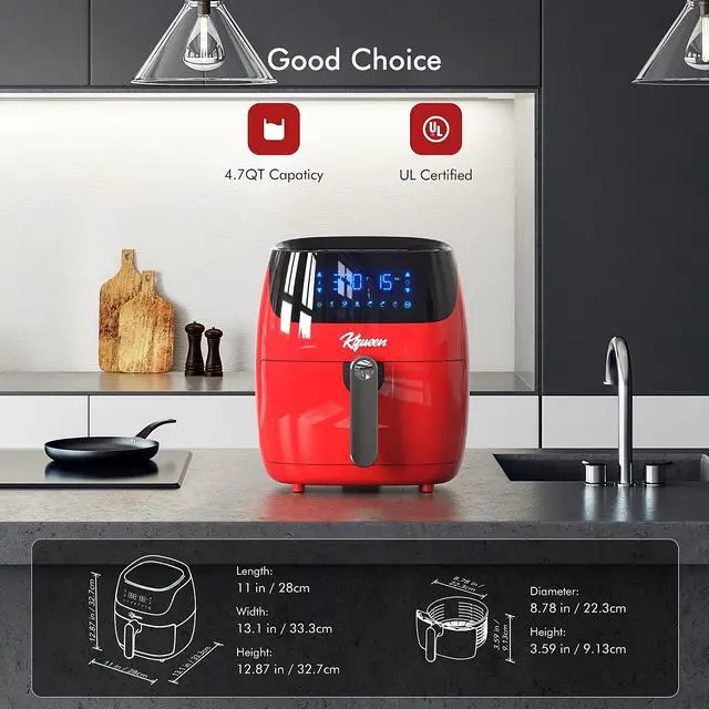 Elevate your kitchen with this bold 4.7Q t red air fryer featuring a responsive LED touchscreen, 6 preset functions, and auto shutoff/overheat protection for safe, worryfree cooking. Using 1400W rapid air technology, it crisps foods with up to 80% less oil, while the mute feature and shakereminder enhance convenience. Perfect for families and small gatherings, it cooks generous portions quickly and safely, all in a modern, vibrant red design.