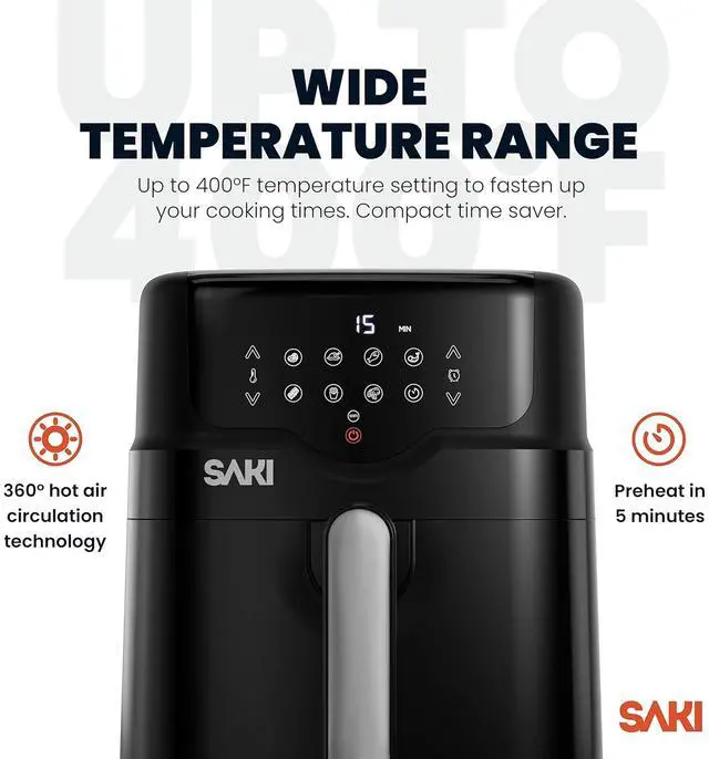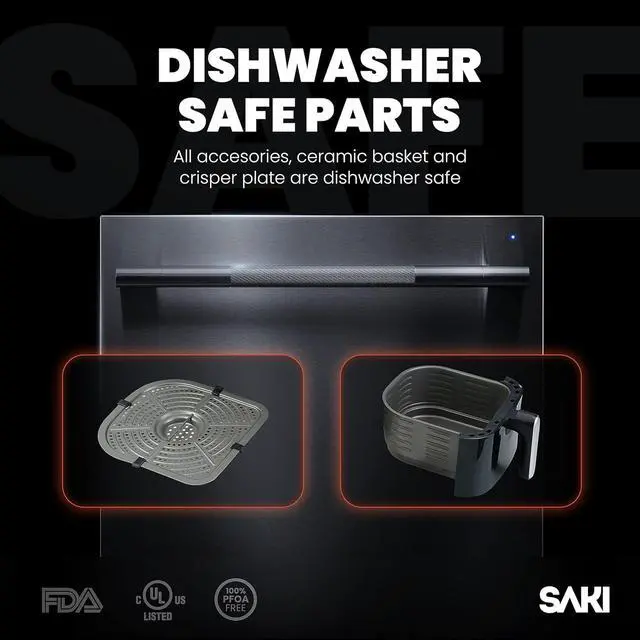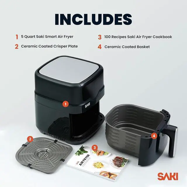 Specifications: Capacity: 4.7 Quart, Max Temperature: 400°F, Controls: Smart App + Digital Touch Panel, Presets: Steak, Chicken, Fish, Fries, Bacon, Vegetables, Shrimp, Preheat, Cooking Technology: 360° Hot Air Circulation, Basket Material: Ceramic-Coated Nonstick (PFOA-Free), Cleaning: Dishwasher-Safe Parts, Design: Compact Countertop, Dimensions: Approx. 11.4" × 11.4" × 10.3".