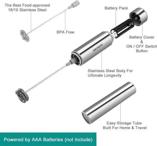 More Convenient: This drink mixer with a on/off switch button, powered by 3 AAA batteries (not included). Just press the button on the top once, the milk frother starts working, so you don't need to hold the button down all the time while using.