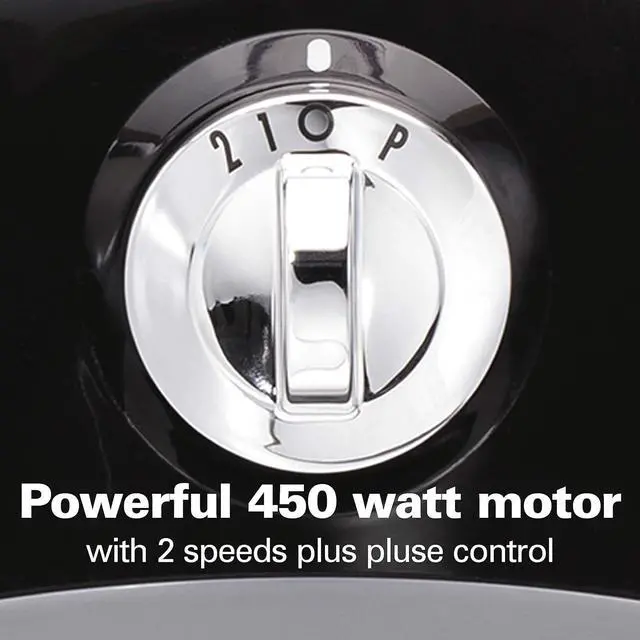 2 speeds plus pulse and 450 watts of power: food processor features low and high speeds plus pulse for the control you need for a variety of recipes