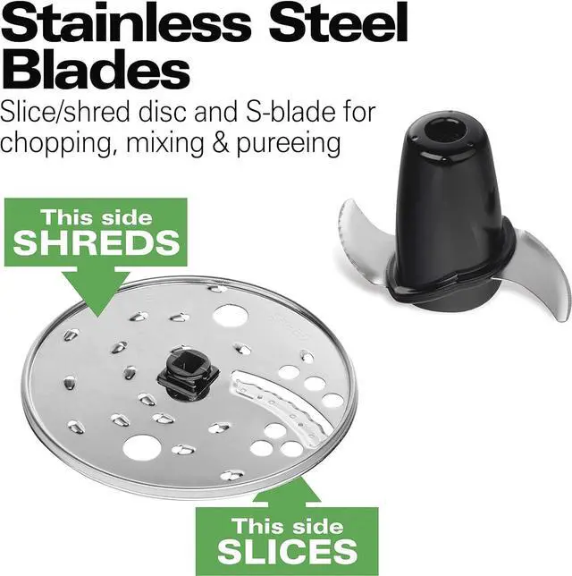 chopper and vegetable chopper: reversible disc slices and shreds, while the stainless steel s-blade chops, mixes and purees