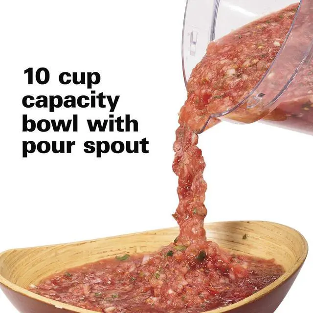 LARGE 10 CUP BOWL WITH POUR SPOUT. Youll be able to process 10 cups of food without having to stop to empty the bowl. Since the bowl has a pour spout, you can transfer dressings, sauces and purees into serving or storage containers without making a mess.