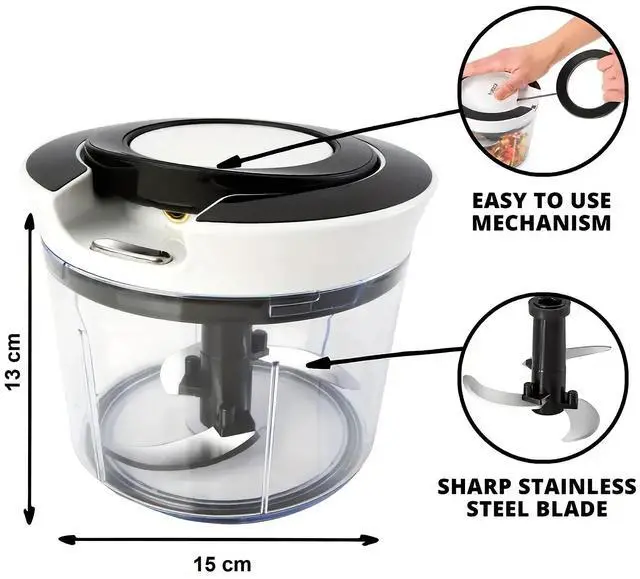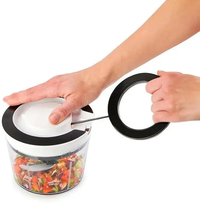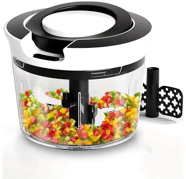 This Food Processor is a manual, pull-cord chopper designed for quickly shredding vegetables for various dishes like salads, soups, and stir-fries. Made from BPA-free plastic and stainless steel, it's dishwasher safe (except for the lid) and includes a cleaning brush for easy maintenance. It features multiple attachments, including spiral and ribbon blades, as well as a whisk for making fluffy omelets. The set includes a 900ml container, a julienne spiralizer, ribbon blades, a finger guard, an egg blender, and a cleaning brush for versatile food prep.
