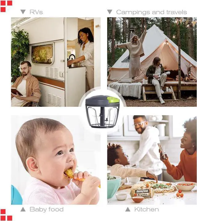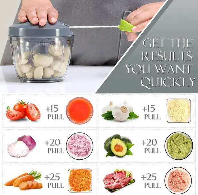 Why do you need a manual food processor? Because it can save you much precious time and labor. You can control the size of foods by controlling the number of times you pull string. 10 times for coarse chopping, 15 times for medium, and 20 times or more for puree. Whats more, You can get chopped Onions in seconds without crying, and chopping garlic without smell. The small pull chopper can handle many foods such as ginger, vegetables, fruits, nuts, herbs, carrot, tomato, avocado and so on.