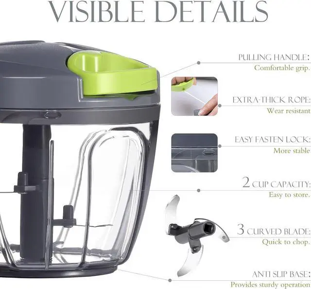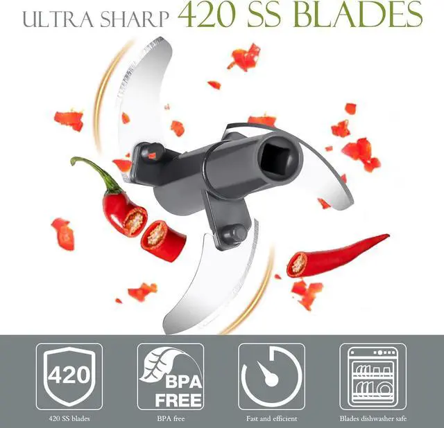 Why choose our mini chopper? The design of our vegetable chopper is ergonomic. We use superior pull rope, ensure that you pull hundreds of thousands of times, the pull string is still intact. The bowl is made of transparent BPA free material to ensure you to keep track the size of ingredients when chopping, we made the bowl thicker to give you a garlic mincer. The blades are made from 420 stainless steel imported from Germany to ensure they don't bend and rust.