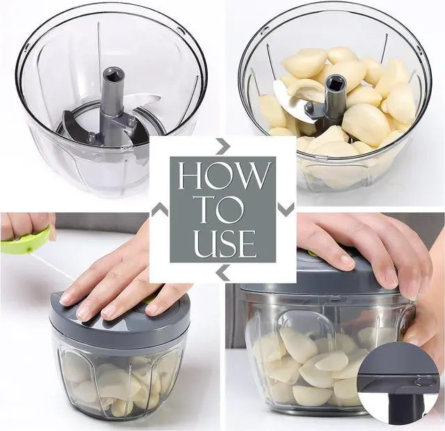How to use the ginger chopper? Firstly, put the blades in the bowl. (The blades are fixed on the small column, you can hold the column without directly touching the blades. ) Secondly, cut the vegetables into large pieces and put in the bowl. Thirdly, close