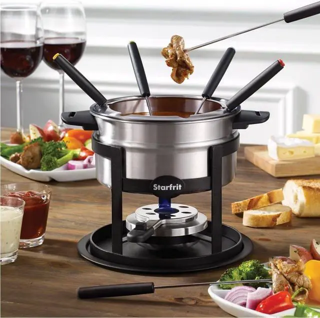 Includes a stainless steel adjustable safety burner and six stainless steel forks with color-coded tips.