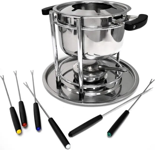 Capacity is 8 cups Made of stainless steel Set includes; fondue pot, lid, burner, stand, tray and six forks Entertain with style for all occasions Hand washing recommended