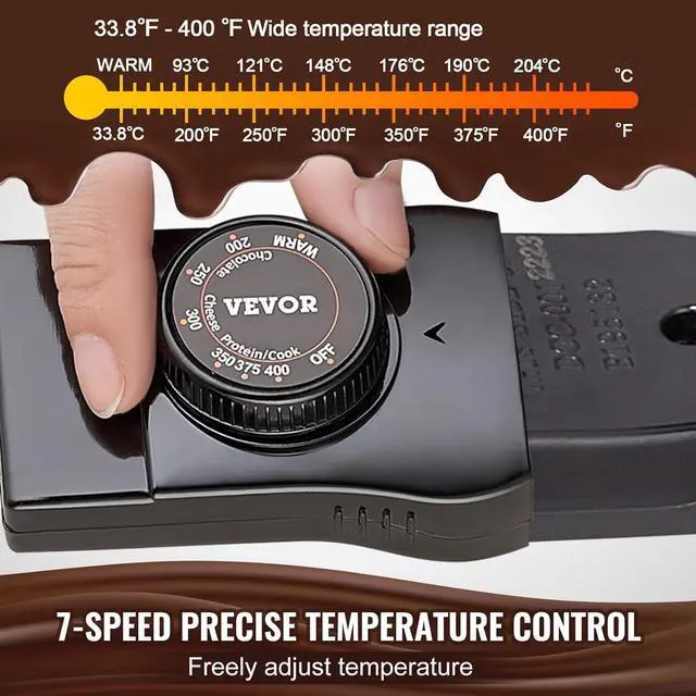 Wide Temperature Range: You can manually adjust the temperature from 33.8 to 401 (approximately 70 to 205), making the chocolate melting warming fondue set easy to operate with precise temperature control.