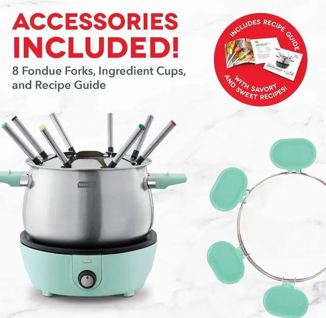 INCLUDES: Dash Deluxe Fondue Maker, 8 color-coded Fondue Forks, Fork Rack (to reduce drips), Metal ring, and Fondue Cups plus Tasteful Recipe Guide.