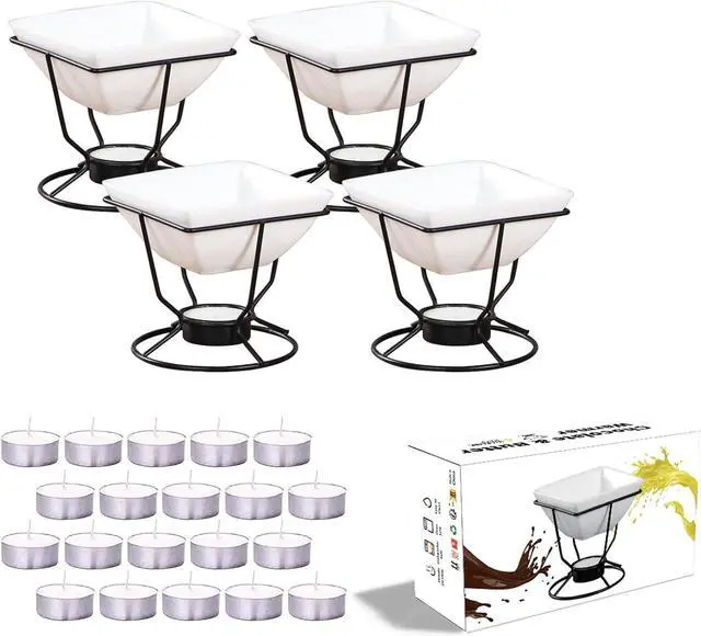 Decent Size: Luvan 4Pcs Fondue Pot Set with 20 Tea light candles for free. Each bowl measure 4.07 inch top diameter and 1.74 inch height, with 7oz( 118.28 ml) large capacity. The metal stand is 3.43 inch height. Stackable design did not waste space in the cupboard.