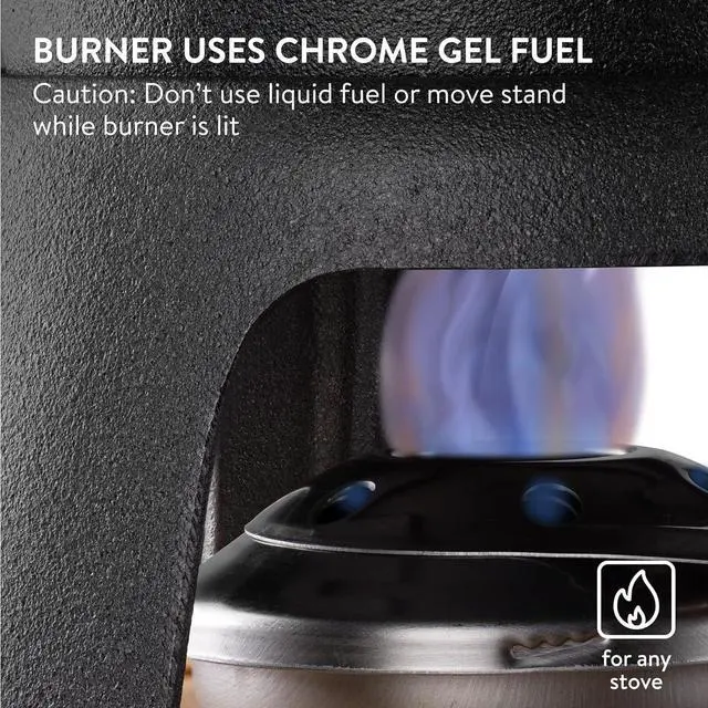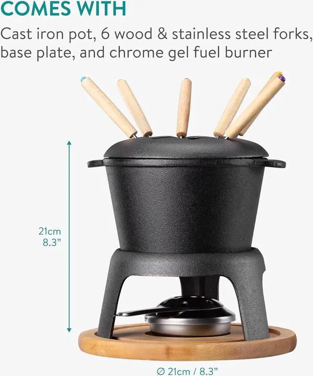 Includes everything you need: cast iron pot, 6 forks, base plate, gel fuel burner, and splash guard.