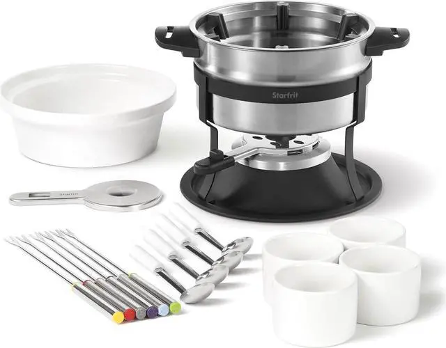 Set Includes: 1.7 qt Pot, 21 oz Ceramic Bowl, Steel Stand & Plates, Magnetic Fork Guide, Adjustable Burner, (6) Forks, (4) Ramekins, (4) Mini Spoons