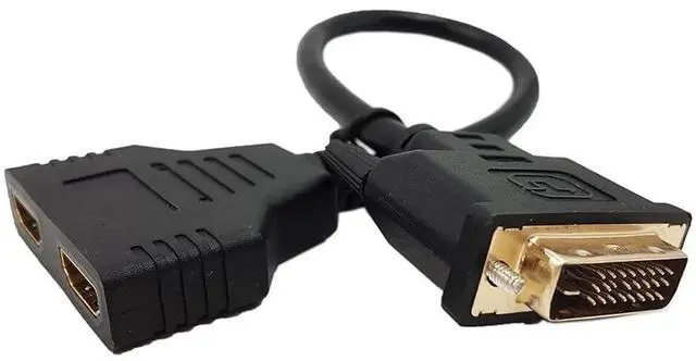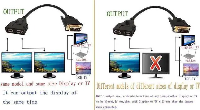 Special Note: This cable is one DVI-D 24+1 to two hdmi Splitter Cable, no built-in chip, when connecting two monitors, must be the same model and the same size monitor!!! Otherwise, only one display is used and the other is turned off, use it as a toggle switch, you can not turn on both monitors at the same time, and both monitors will not have an image.