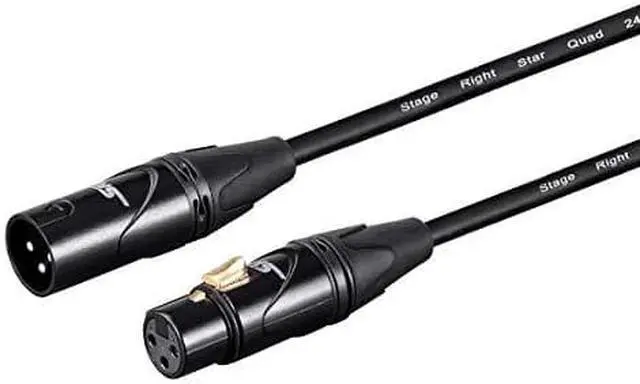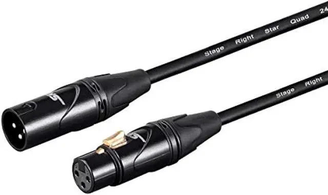 Introducing Stage Right by Monoprice STARQUAD XLR Microphone Cables. These are Pro-Grade, balanced microphone cables, commonly used to carry low-level signals. Microphones produce very low level signal feeds, which are easily susceptible to magnetic interference. Microphone outputs must be amplified and when a microphone feed is amplified, any interference will also be amplified. Stage Right STARQUAD XLR Microphone Cables' four cores are very tightly twisted with each other and rotate over a relatively short length, very similar to what is found in an Ethernet cable. This arrangement results in a greatly improved rejection of electromagnetic interference, compared to standard two-core balanced mic cables.