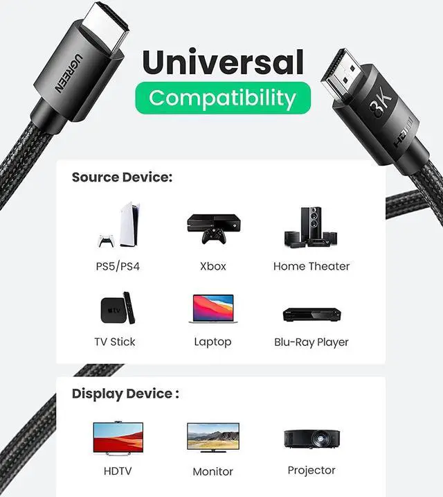 Widely Compatibility: This 8K HDMI braided cord is compatible with TV Box 4K, PS5, PS4 Pro, PS3, Roku, Nintendo Switch, Wii U, Xbox 360, Xbox one X/S, Laptop, PC, Blu-ray player, AV Receiver, TV stick, TV Box, DVD player, LG TV, Sony 8K UHD TV, Samsung QLED TV, Soundbar, Projector, Monitor and more