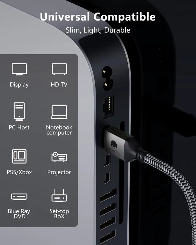 Universal Plug-and-Play Compatibility: Effortlessly connect legacy and next-gen devices. CONMDEX HDMI 2.2 cable is fully backward compatible with HDMI 2.1, 2.0, and 1.4 standards, ensuring seamless integration across laptops, Blu-ray players, HDTVs, monitors, gaming consoles (Series X/S), and high-performance graphics cards (NVIDIA RTX/AMD)a true single-cable solution for your entire entertainment and gaming ecosystem