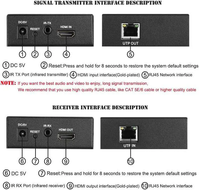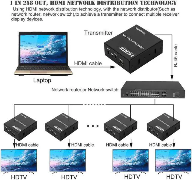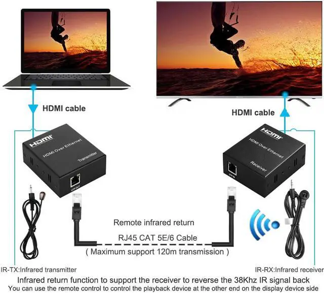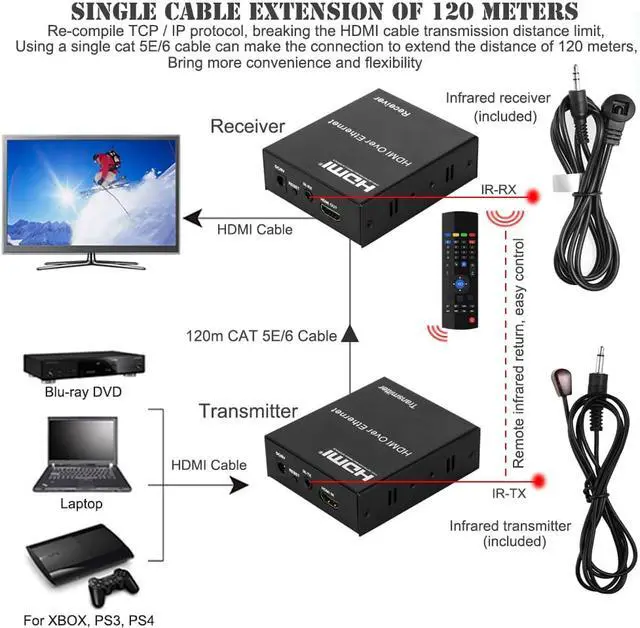 It transmits your HD display with the high resolutions up to 120 meters away from your HDMI or DVI-D source by using one CAT5e/6 cable.