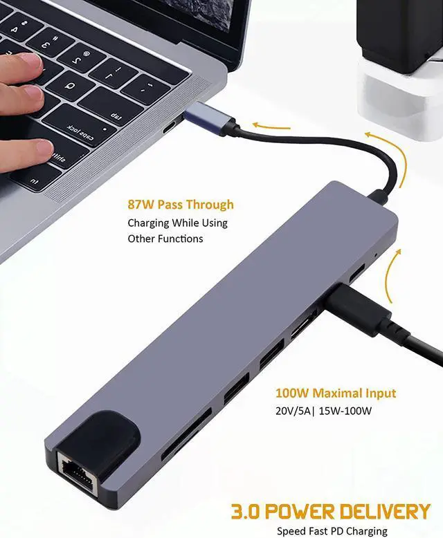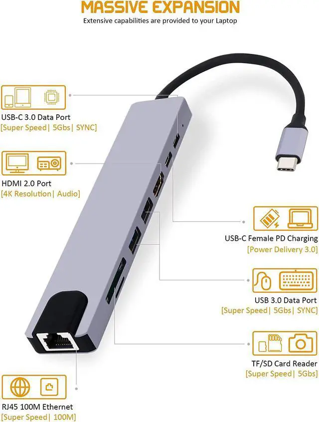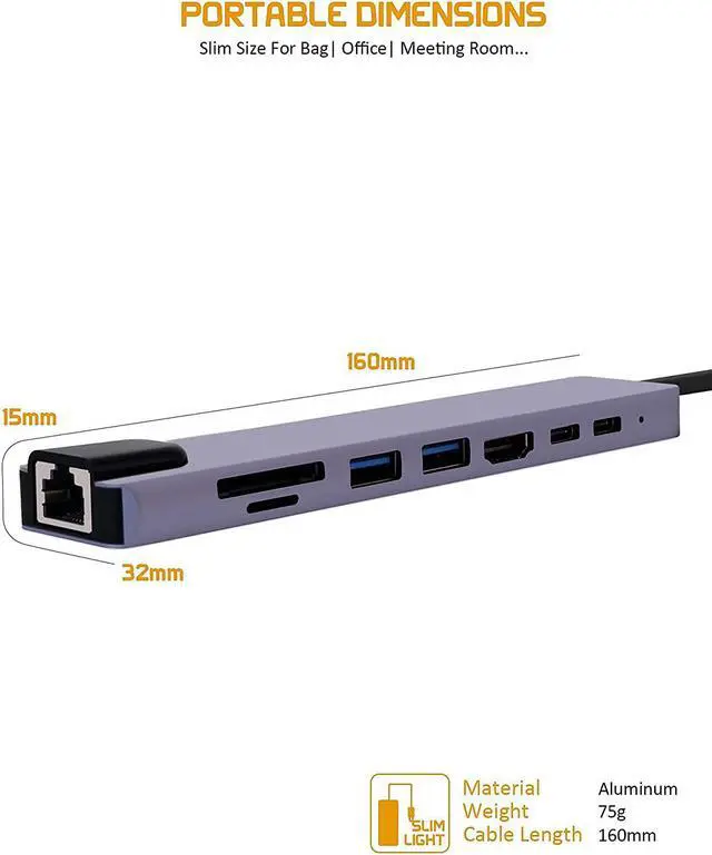 Multiport USB Hub \u2013 GREEN ROBO BROS 8 Port USB Extension Hub includes 1 USB Type-C Female PD Charging port, 1 HDMI 4K output port, 1 TF SD card slot, 1 SD card slot, 2 USB 3. 0 Type A ports, 1 USB 3.0 USB-C port, RJ45 Ethernet Port