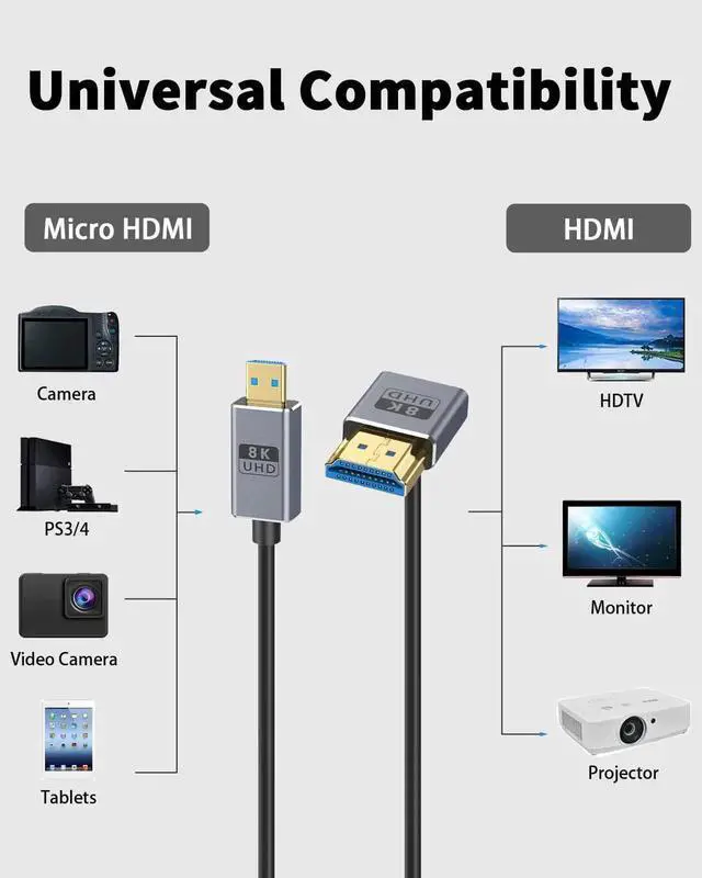 Ultra-Thin Micro HDMI Cable: This ultra-thin HDMI 2.1 cable features a 2.5 mm diameter and a shielded core of only 1.87 mm, making it easy to bend and highly adaptable to devices. It is more environmentally friendly, offers higher elasticity, and is less prone to tangling and breakage. Our coaxial cable is "thinner, softer, and easier to store" while providing "ultra-stable, " "ultra-high-definition, " and "ultra-fast" performance.