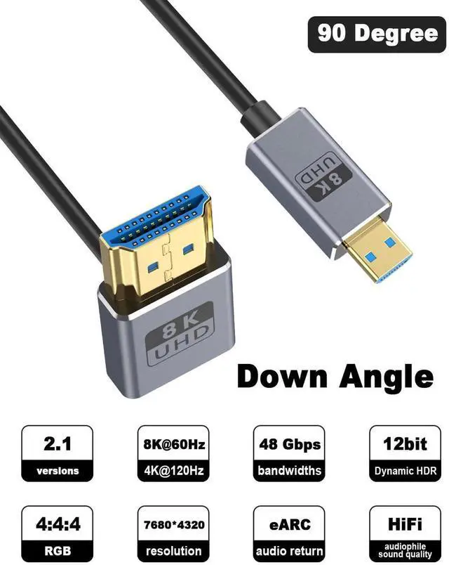 90 Degree HDMI to Micro HDMI Cable: Specifically designed for connecting cameras or digital single-lens reflex (DSLR) cameras to portable monitors, this cable is ideal for tight spaces and prevents damage caused by long-term bending. The flexible and slim design is perfect for compact spaces.