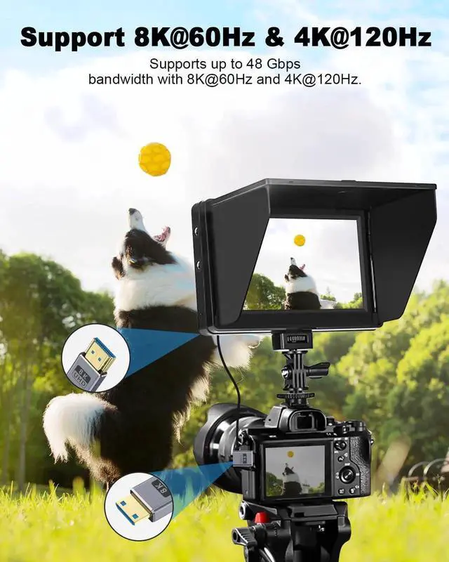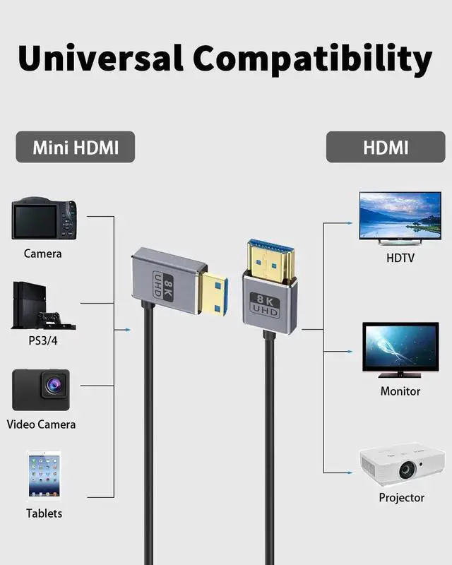 The HDMI to mini HDMI cable supports the latest resolutions including 8K@60Hz, 4K@144Hz, 4K@120Hz, 4K@60Hz, and 1080P@240Hz, providing you with a better visual experience. It is backward compatible and supports HDMI 2.1 / 2.0 / 1.4, allowing for smooth and clear high-speed action video on HDTVs, monitors, or projectors.