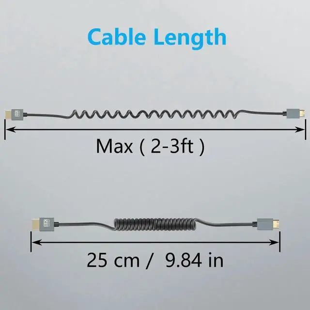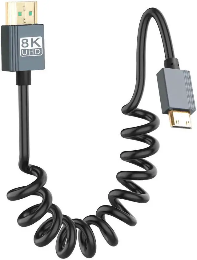 8K Mini HDMI to HDMI Coiled Cable extends smoothly from 1 to 3 feet, coiled design meet your different distance requirements, OD: 3.6mm flexible lightweight and does not take up space, helps you keep your desktop tidy
