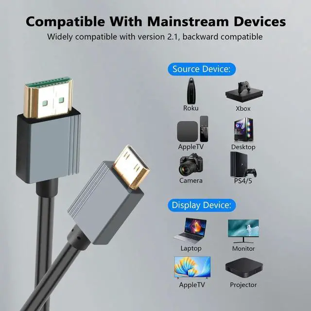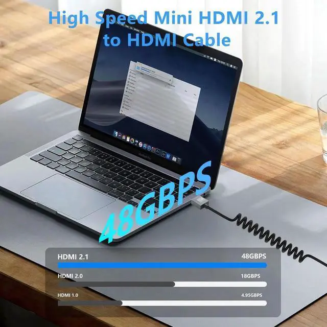 Ultra-thin HD HDMI to Mini HDMI Coiled Cable support HDMI 2.1 8K@60Hz and 4K@120Hz resolutions 3D and Dynamic HDR Up to 48Gbps, you can enjoy the clarity and smoothness of Ultra HD