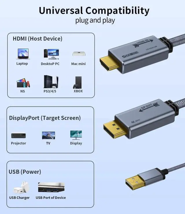 HDMI to Displayport Adapter 4K@60Hz, 2K@120Hz, 1080P@165Hz, HDMI Male Source to DisplayPort Male Monitor Cable, HDMI to DP with USB Power Cable Compatible with PS5, Xbox, Switch, Laptop 3.3ft