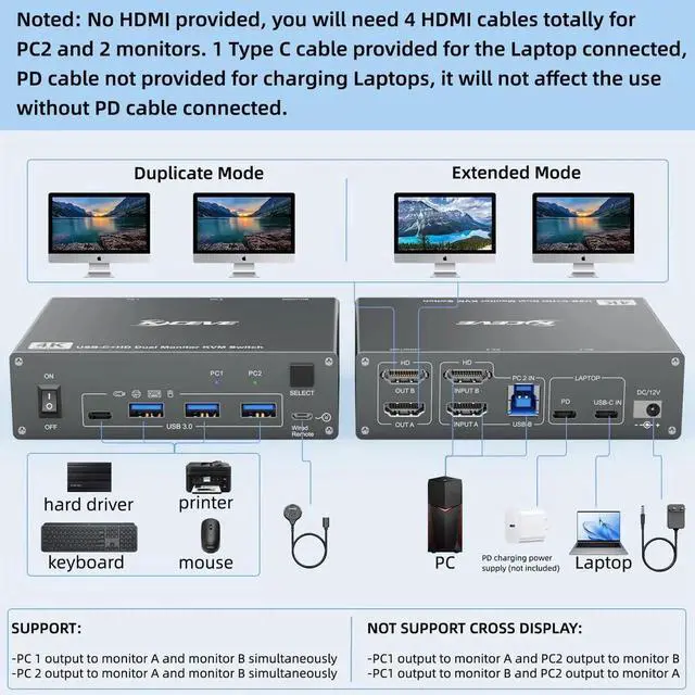 Additional Features- [Support 60W PD Fast Charging]Designed with PD charging port to give enough power for your laptop during using. This is a very stable 2 monitors USB C KVM switch. KVM switch laptop desktop supports the follow resolutions, 4k@60Hz, 2560x1440@/120hz/60hz, 1920x1440@144hz/120hz/60hz, etc. Real test support 60W charging, but some product page stress it support 100w is not the real data.