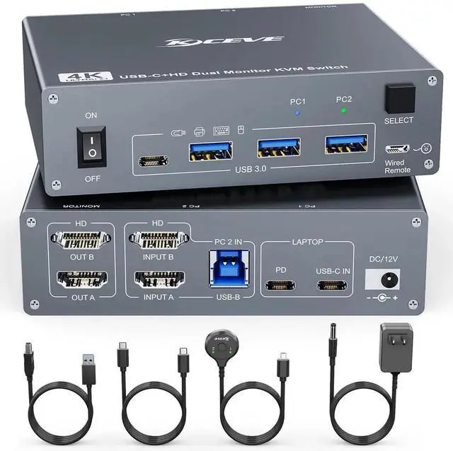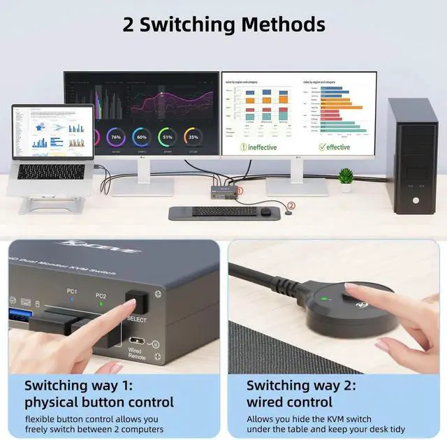 - [Support 2 Switching Mode]This Type-C USB-C 2 monitors 2 computers KVM switch support physical button and wired control. The wired control is upgraded, it's size is bigger and touch feel is more comfortable. By using the wired control you can hide the dual monitor KVM laptop and desktop under the table and keep the desk tidy.