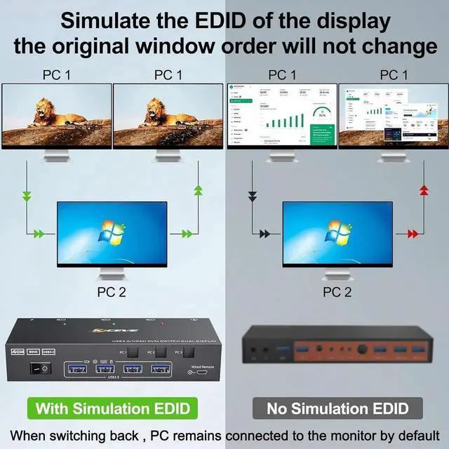 This Dual monitor KVM Switch performs monitor EDID emulation when you switch to another computer - PC still connected to the monitor by defaults and store the resolution and refresh rate of the display, the windows on each computer will not be rearranged on every switch.
